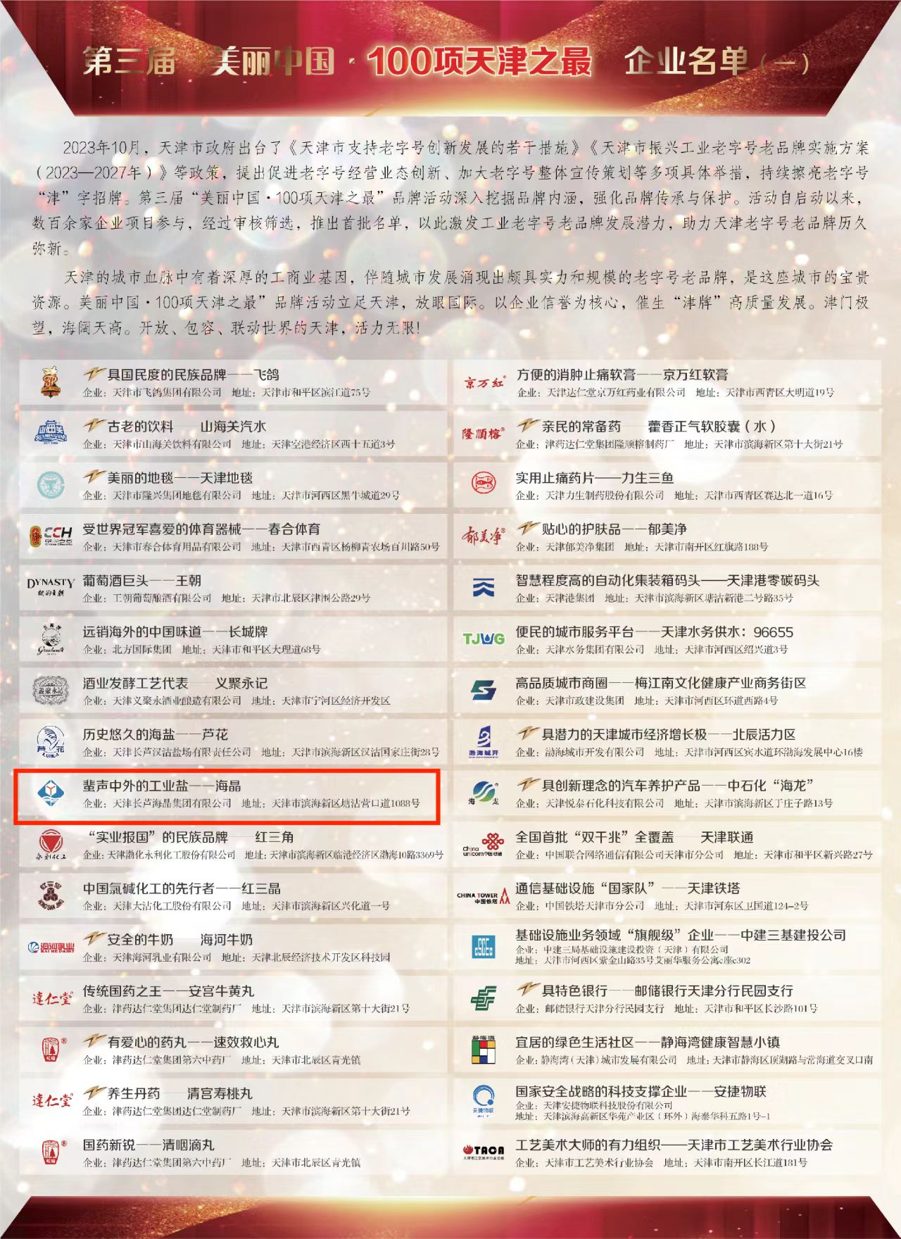 1月30日,《中国企业报》刊登了第三届“美丽中国•100项天津之最”品牌首批名单,公司凭借蜚声中外的工业盐——“中国·yL23411永利(集团有限公司)-官方”品牌入榜。